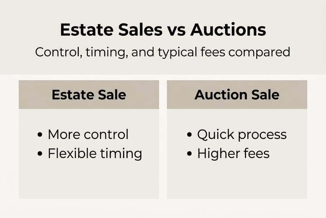 The distinction between estate sales, auction sales, and private sales matters considerably. Each channel carries different cost structures, timescales, and degrees of control over pricing and buyer selection.